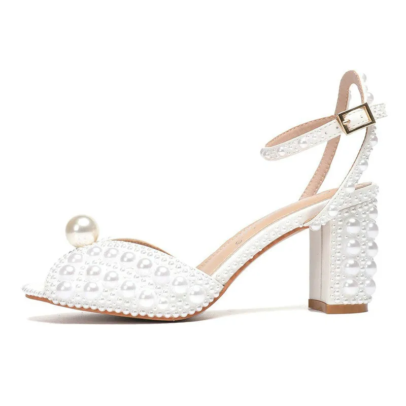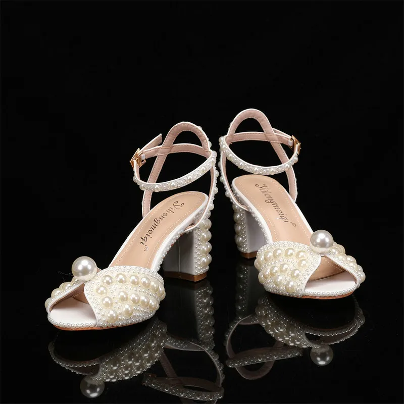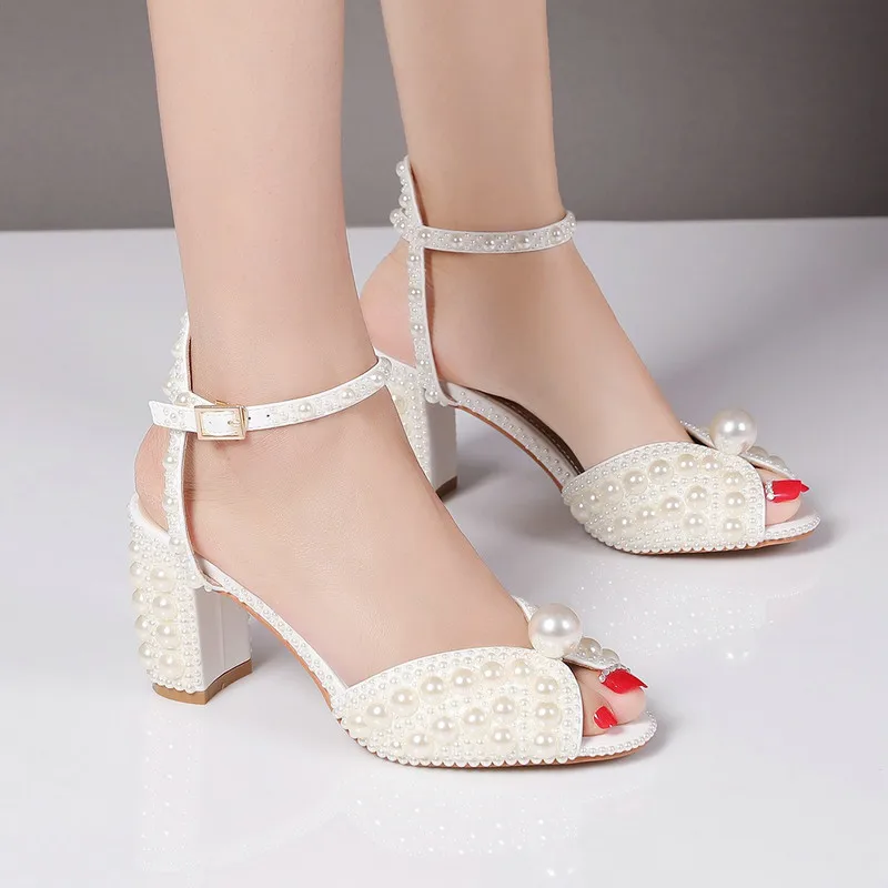 2025 New High Heels Thick Heel Shallow Mouth Women's Pearl Sandals Wedding Shoes Bridesmaid Shoes heels_bridal