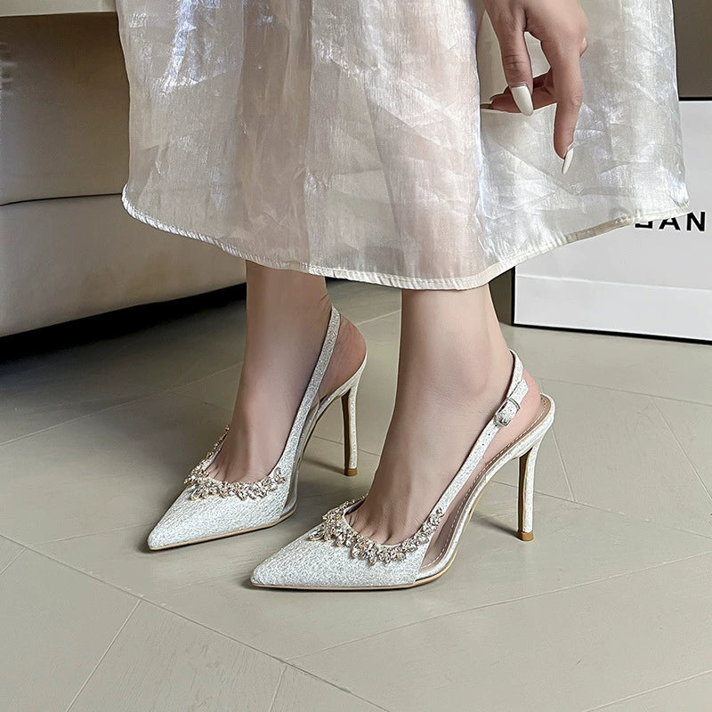2025 Spring and Summer Pointed Toe Low-Cut Toe Cap Slingback Sandals Women's Stiletto Heel White Beautiful French Rhinestone Classy High Heels heels_bridal