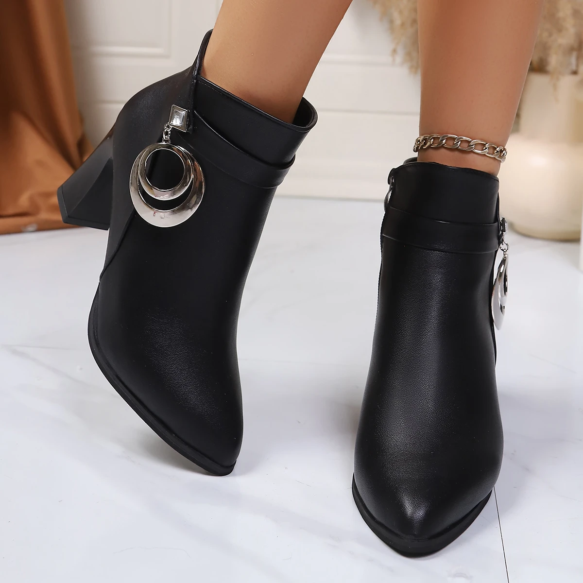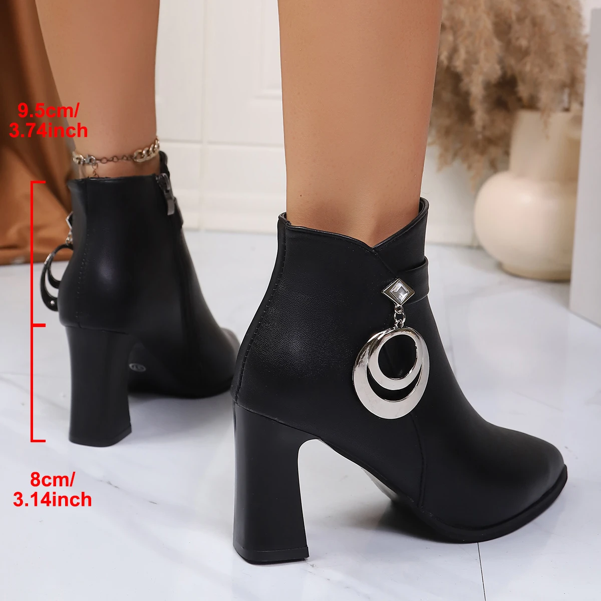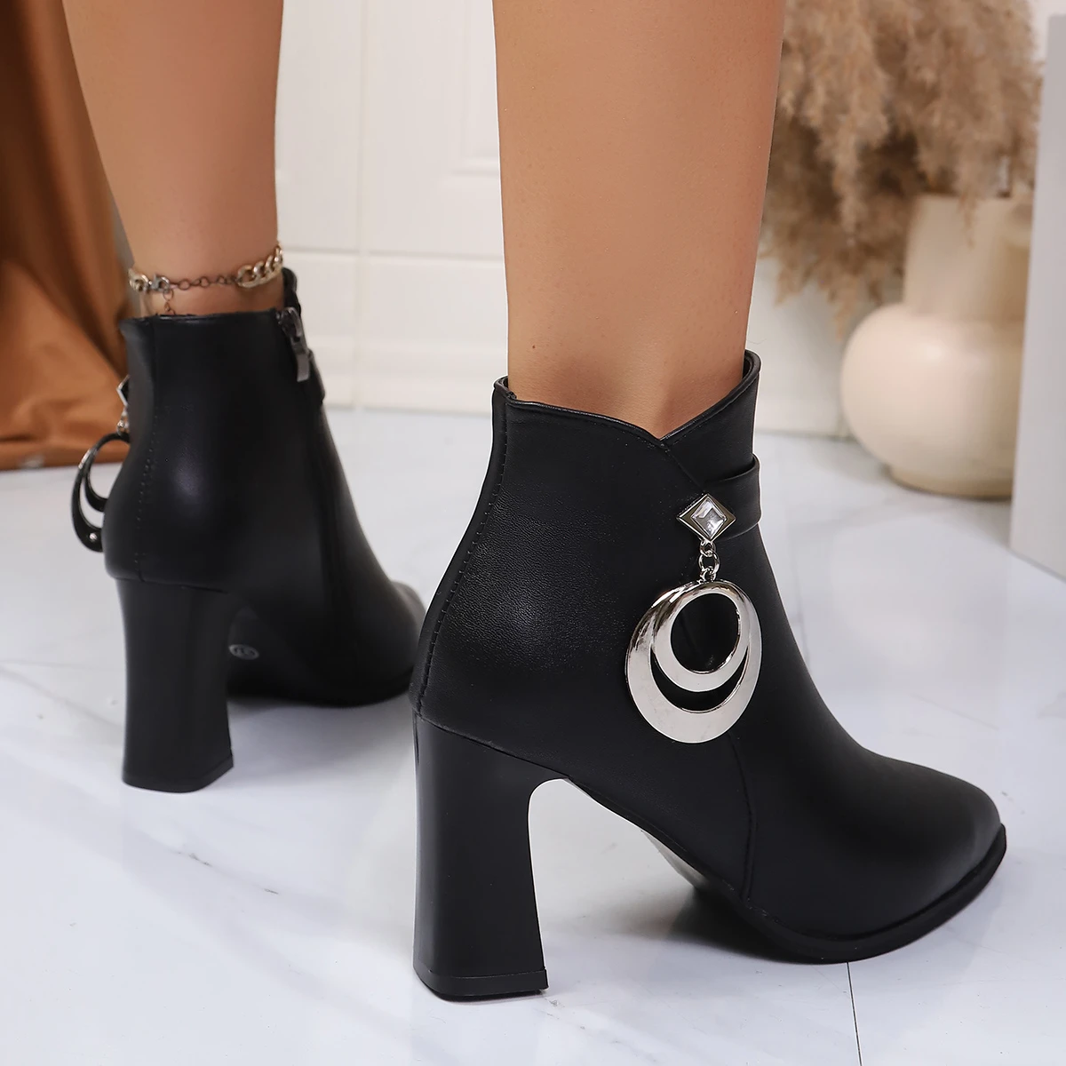 Fashion Short Boots High Heel Women's Boots Autumn Winter Thick Heel Fashion Diamond Pendant Zipper Pointed Toe Leather Boots boots_highheel