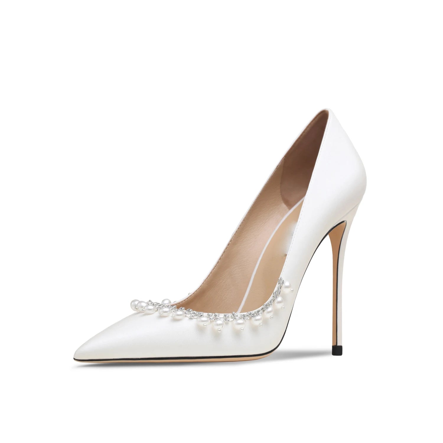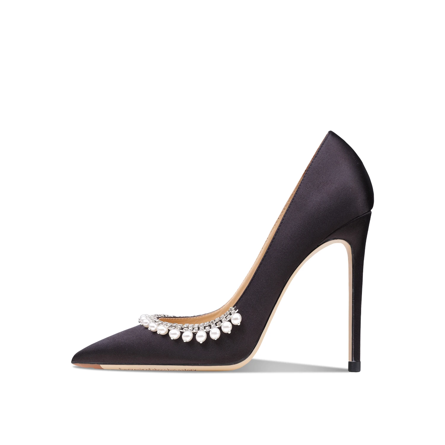 Genuine Leather Black Pearl Buckle High Heels For Women 2024 New Style Stiletto Pointed Shallow Mouth Dress Banquet Satin Pumps heels_stiletto