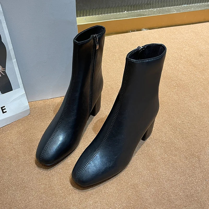 Leather Medium Heeled Short Boots for Women PU Soft Ankle Boots Side Zipper Comfortable Office Women Shoes Square Ladies Boats boots_highheel