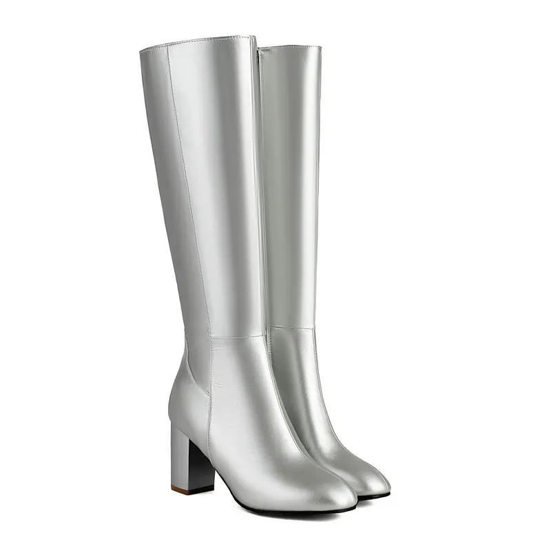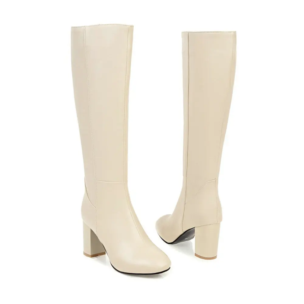 Plus Size 48 Square Toe Knee High Boots Women Side Zipper Winter Warm Long Shoes Comfort Thick Heel 7.5CM Black Leather boots_highheel