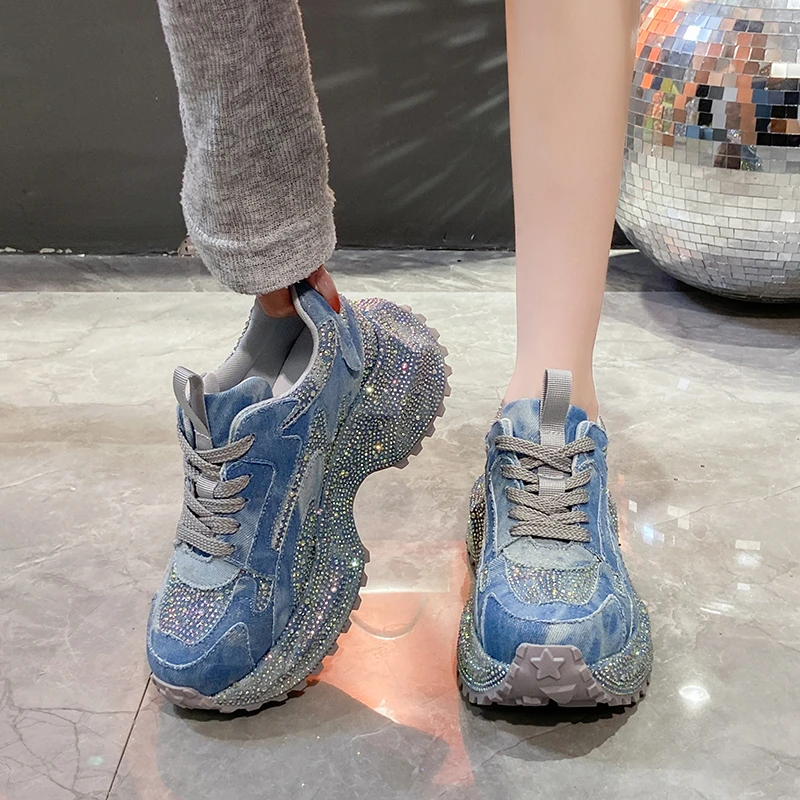 Rhinestone Cover Thick Sole Denim Canvas Sneaker Woman Bling Rivet Chunky Daddy Shoe Ladies Luxury Brand Design Crystal Zapatos sneakers_platformis sneakers_luxury