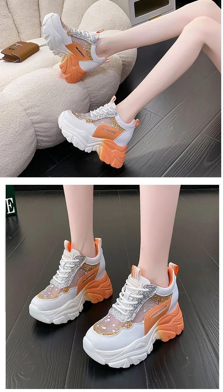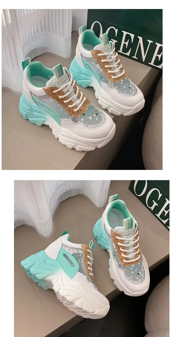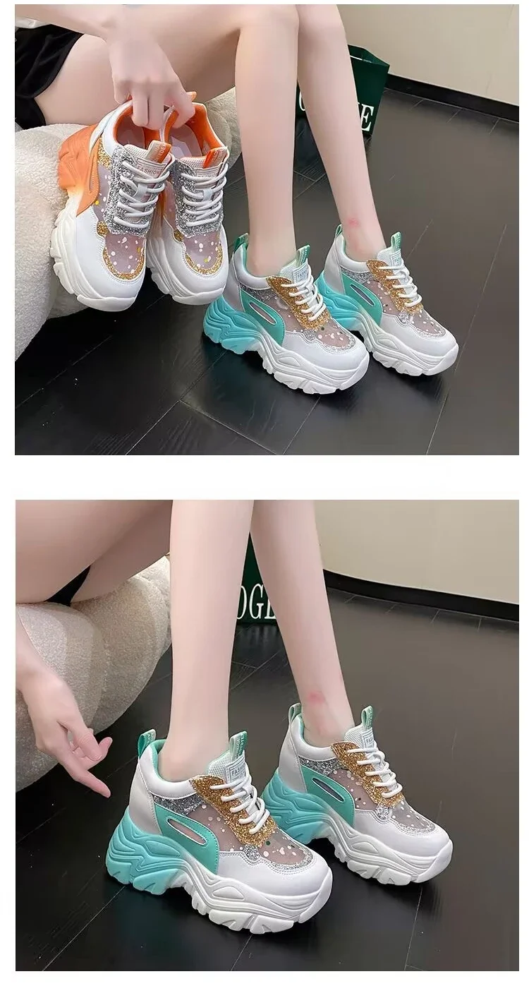 Sequin Platform Vulcanized Shoes for Women Sneakers 2024 Mesh Lace-up Women's Walking Shoes Inner Height Increasing Women Shoes sneakers_platform