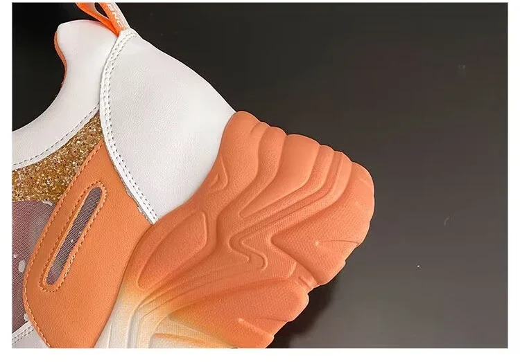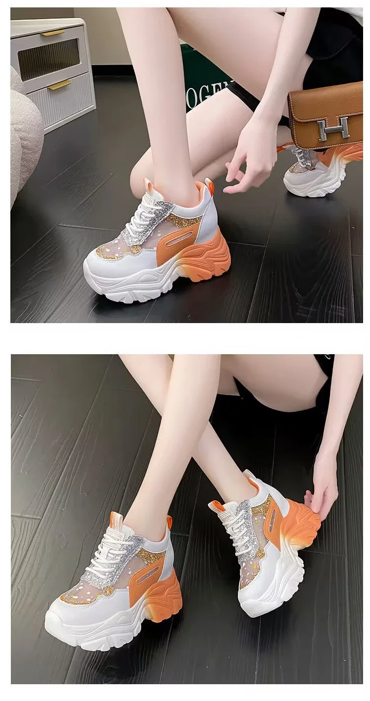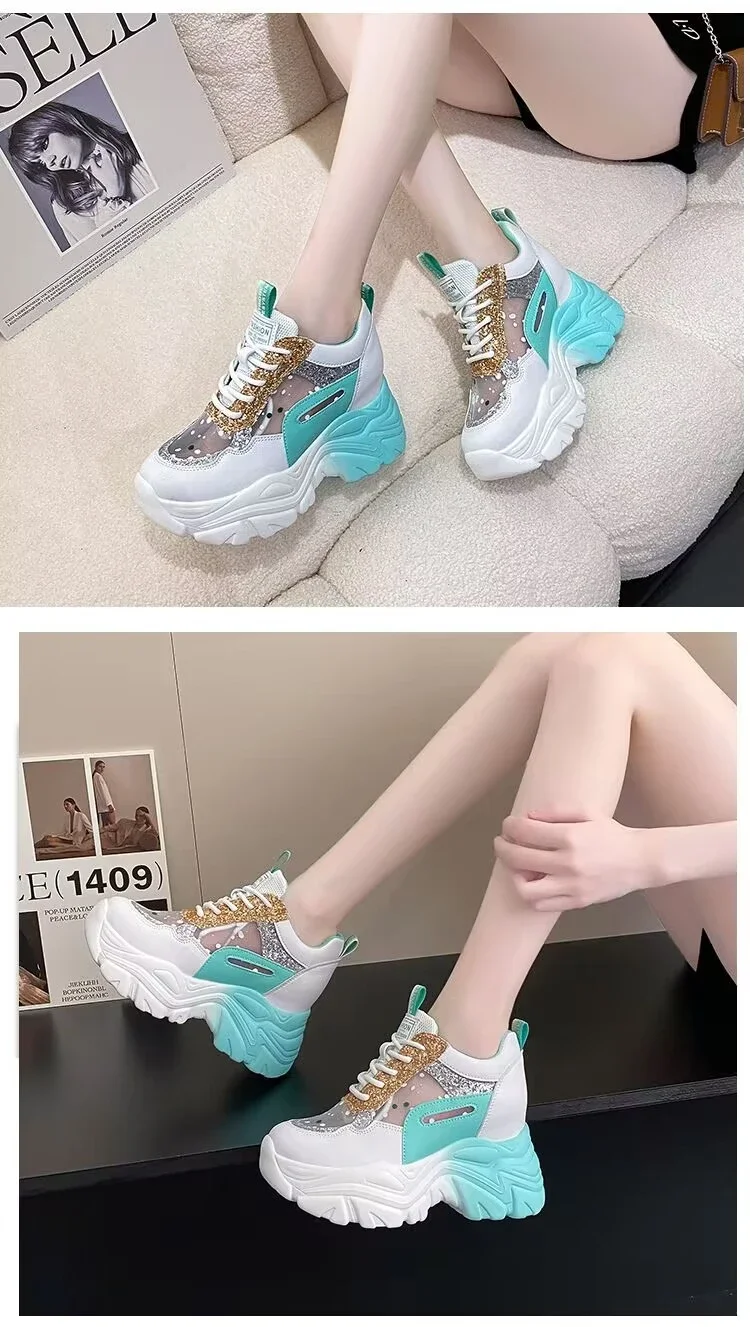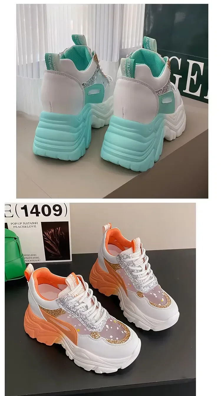 Sequin Platform Vulcanized Shoes for Women Sneakers 2024 Mesh Lace-up Women's Walking Shoes Inner Height Increasing Women Shoes sneakers_platform