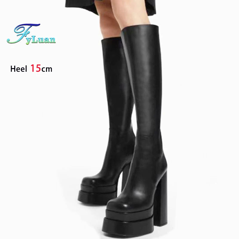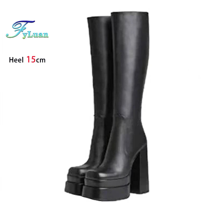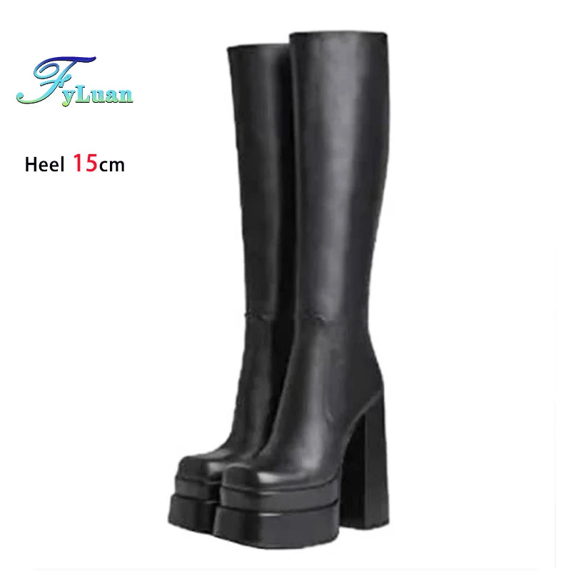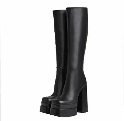 Size 35-46 Women Square Toe Knee-high Boots 15CM Back Zipper Black Chunky Platform Boots Europe and America New Goth Woman Shoes boots_platform