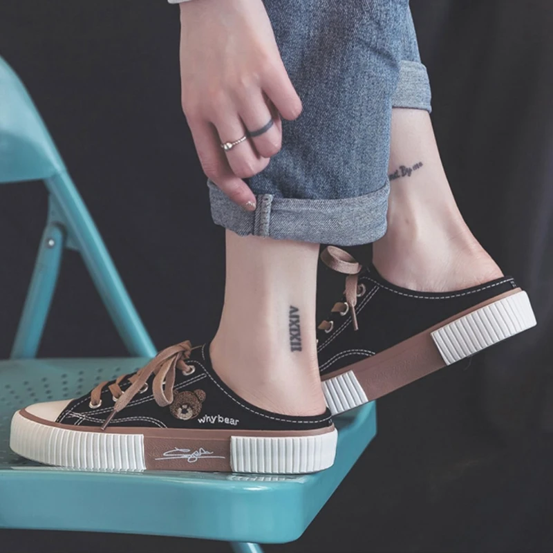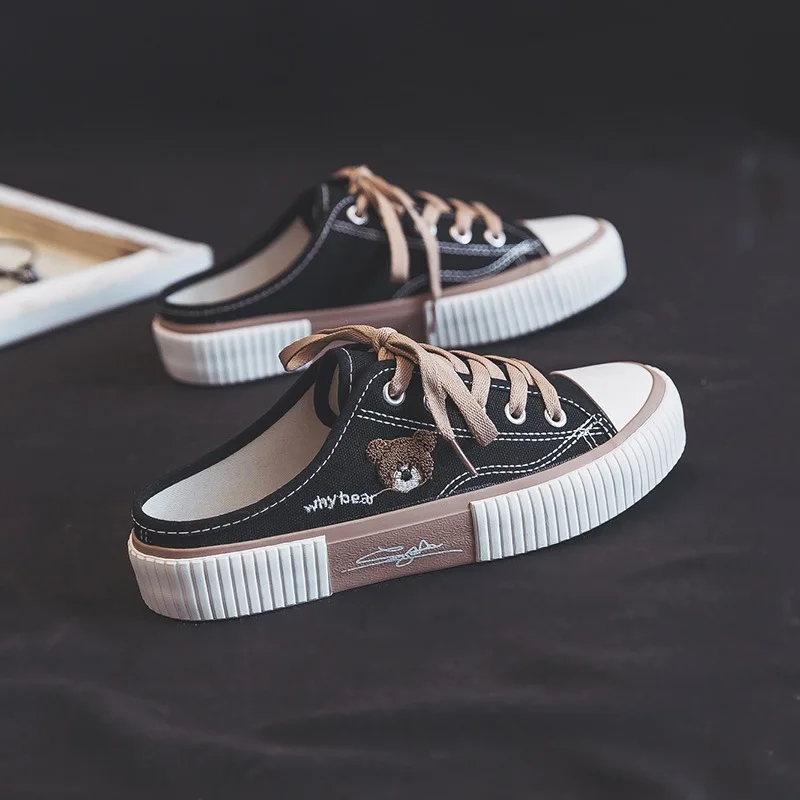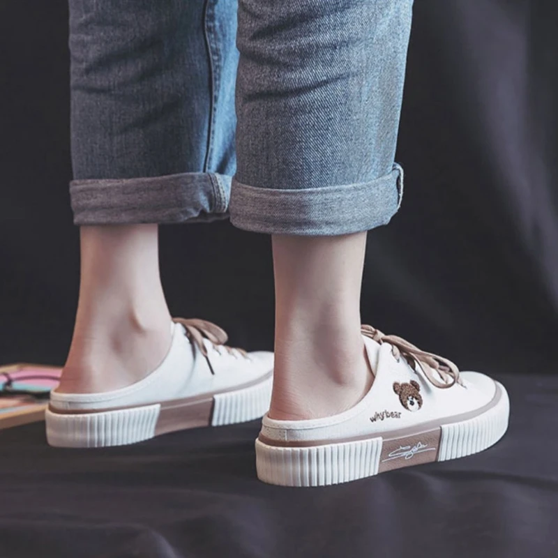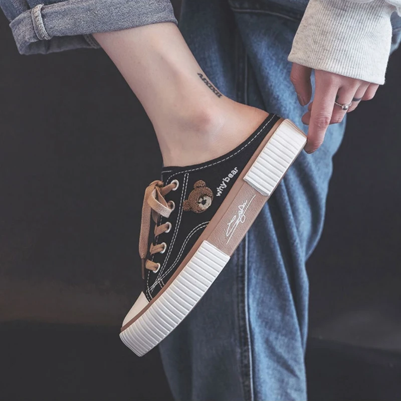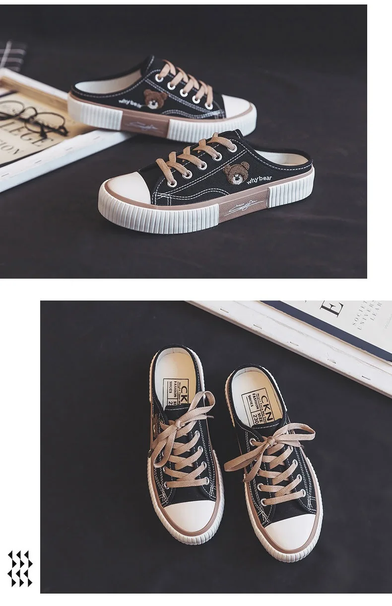 Spring Women Cute Bear Canvas Shoes: New Flat Casual All-match Half Slippers