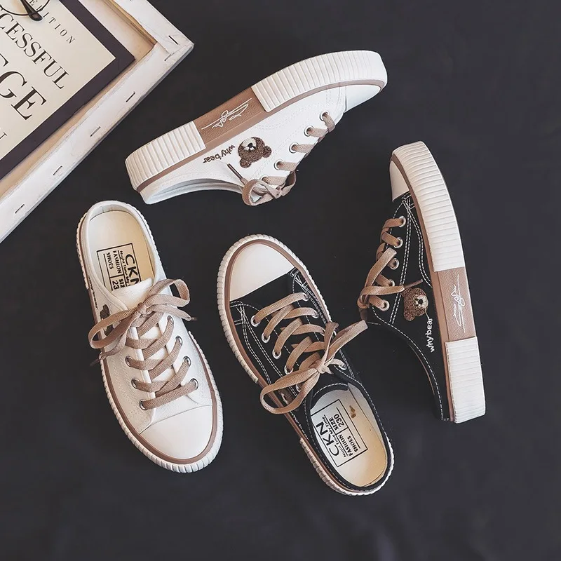 Summer Cute Women's Canvas Shoes New Womens Half Slippers Korean Version Female Vulcanized Shoes Lace-up Flat Sneakers Zapatos sneakers_women