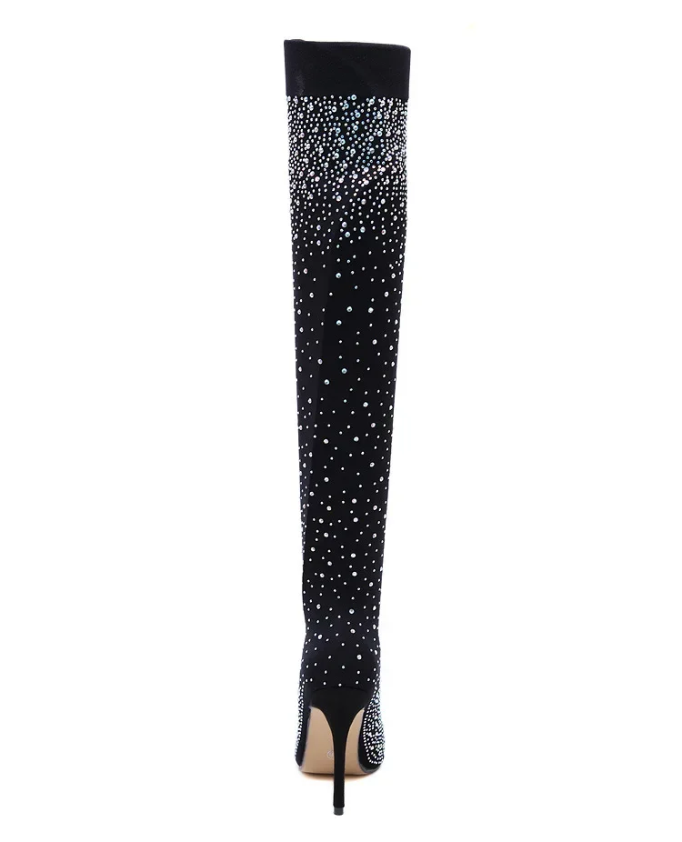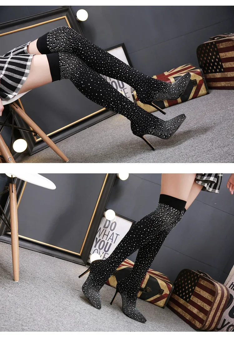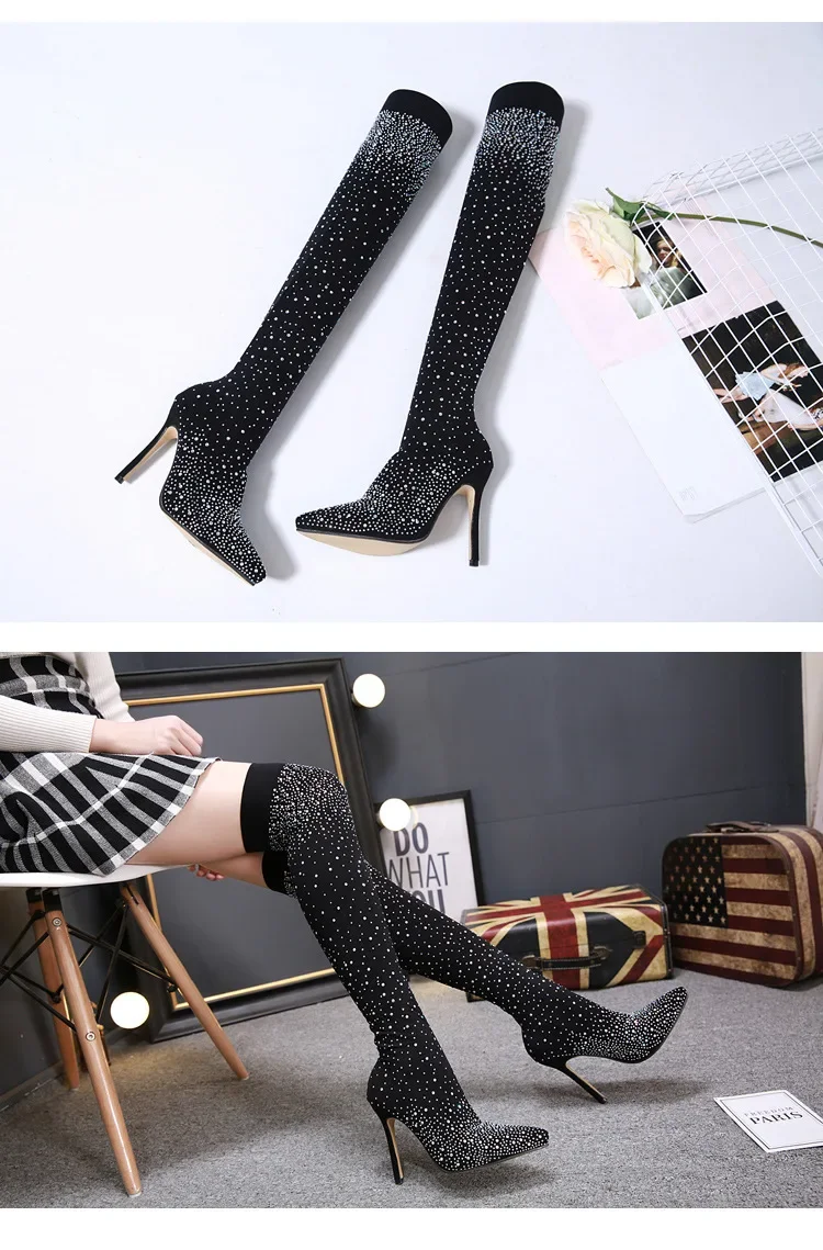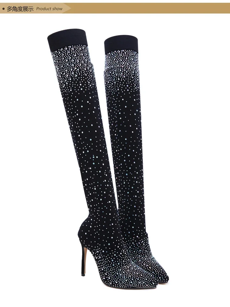Summer Knee Boots Luxury Woman Shoes Rhinestone Pointed Toe Sexy High Heels Plus Size 43 Thigh High Sock Botas De Mujer boots_highheel