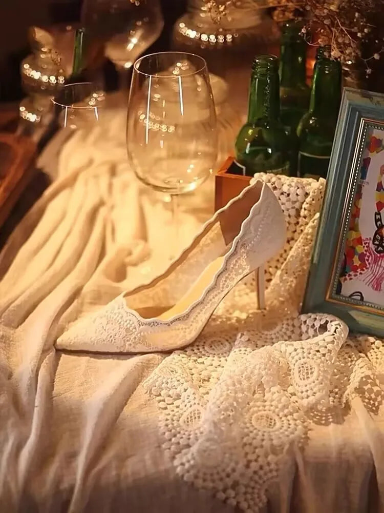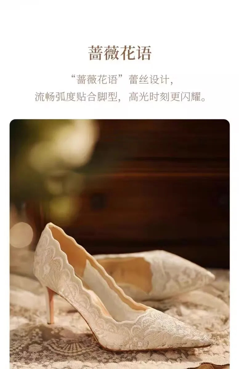 White Wedding Shoes Bridal Shoes Design Sense Niche Lace Pointed Stiletto Heel Shallow French High Heels Female Temperament heels_stiletto
