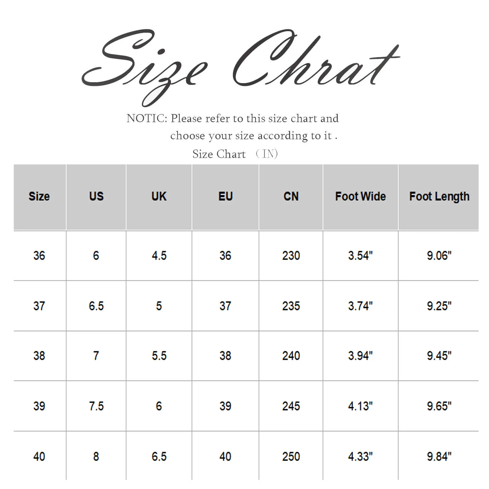 | Size | US | UK | EU | CN | Foot Wide | Foot Length |