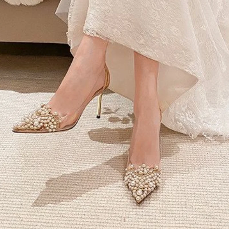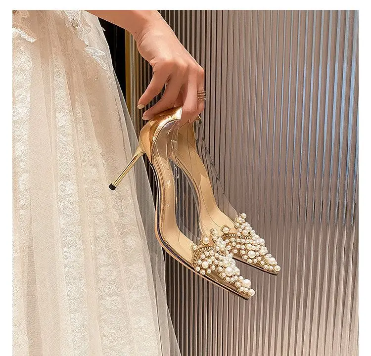 Women's Single Shoes Summer New Ultra High Heels Pointed Pearl Transparent Shallow Heels Fashion Temperament Stiletto Sandals heels_bridal
